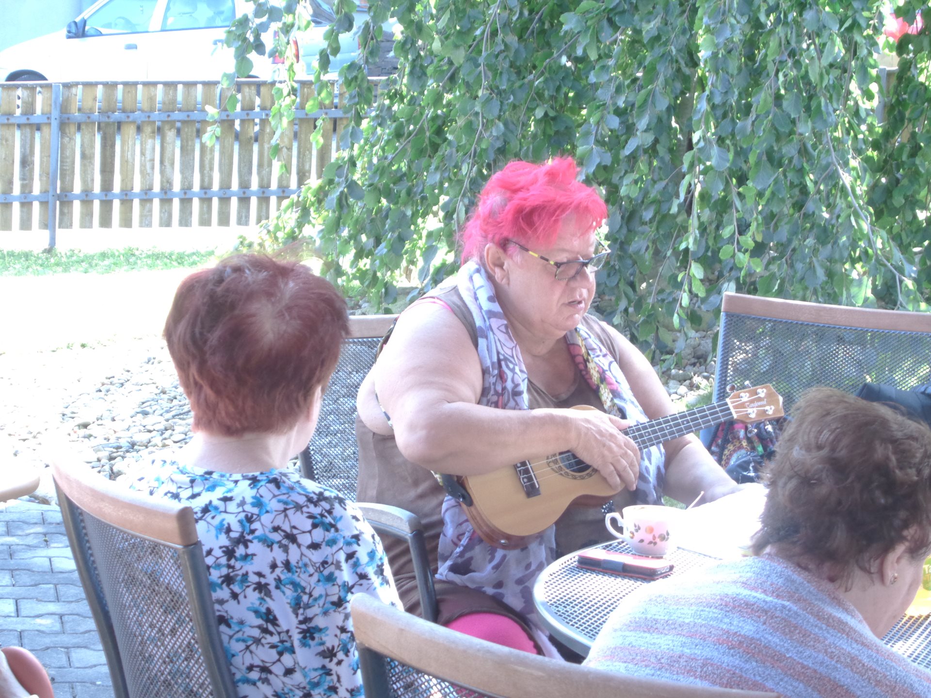 Muzikoterapii u nás poskytuje paní Mösnerová Hana "Bobina", která je kvalifikovaným terapeutem. Muzikoterapii provozuje již několik let a má zkušenosti s přístupem k naší cílové skupině. Uživatelé se mohou na muzikoterapii těšit 1 x za 14 dní, většinou v pondělí dopoledne. Pokud je příznivé počasí, probíhá muzikoterapie pod pergolou domova a také se muzikoterapeutka věnuje i uživatelům, kteří jsou imobilní a navštěvuje je na pokojích.