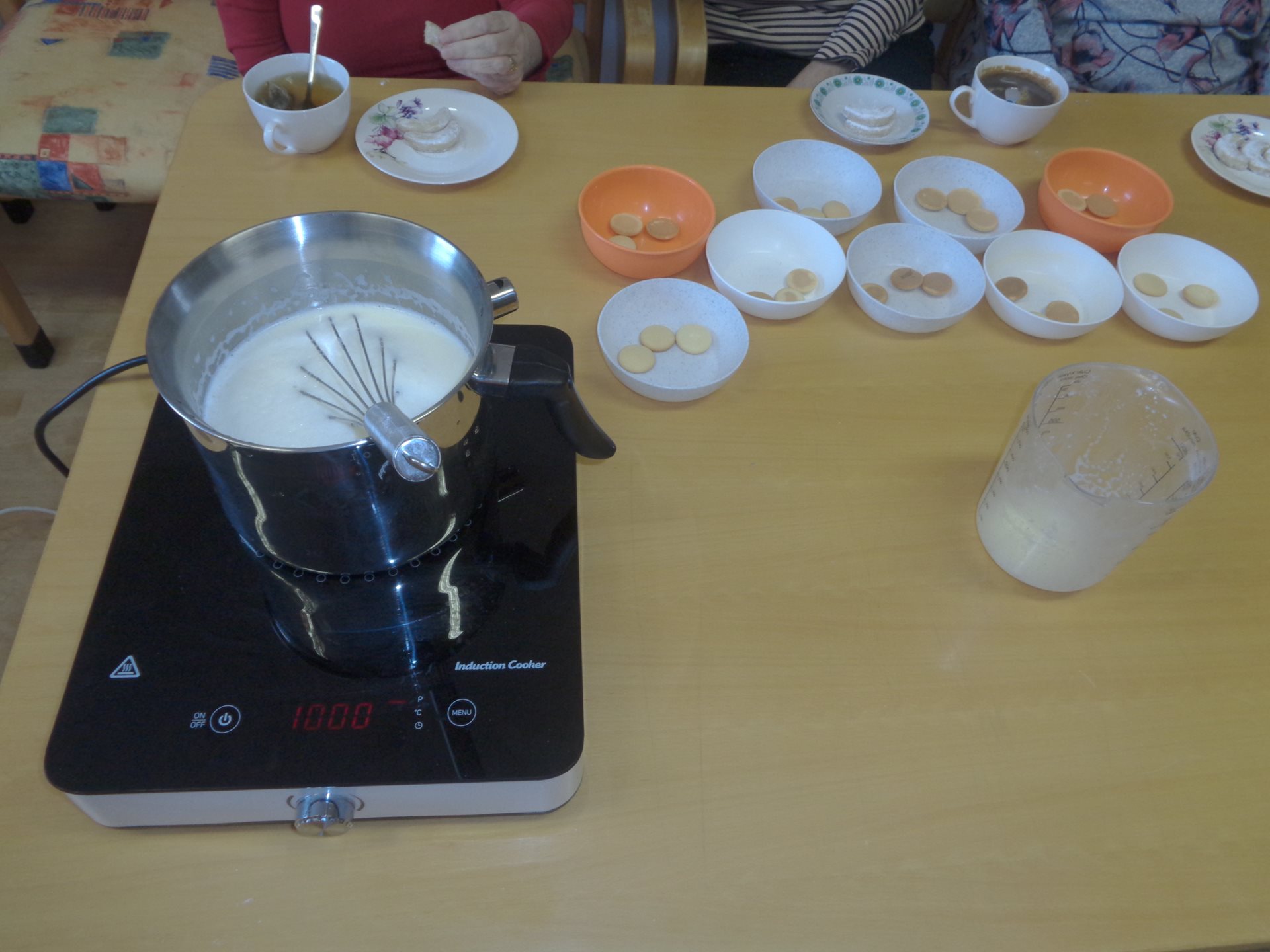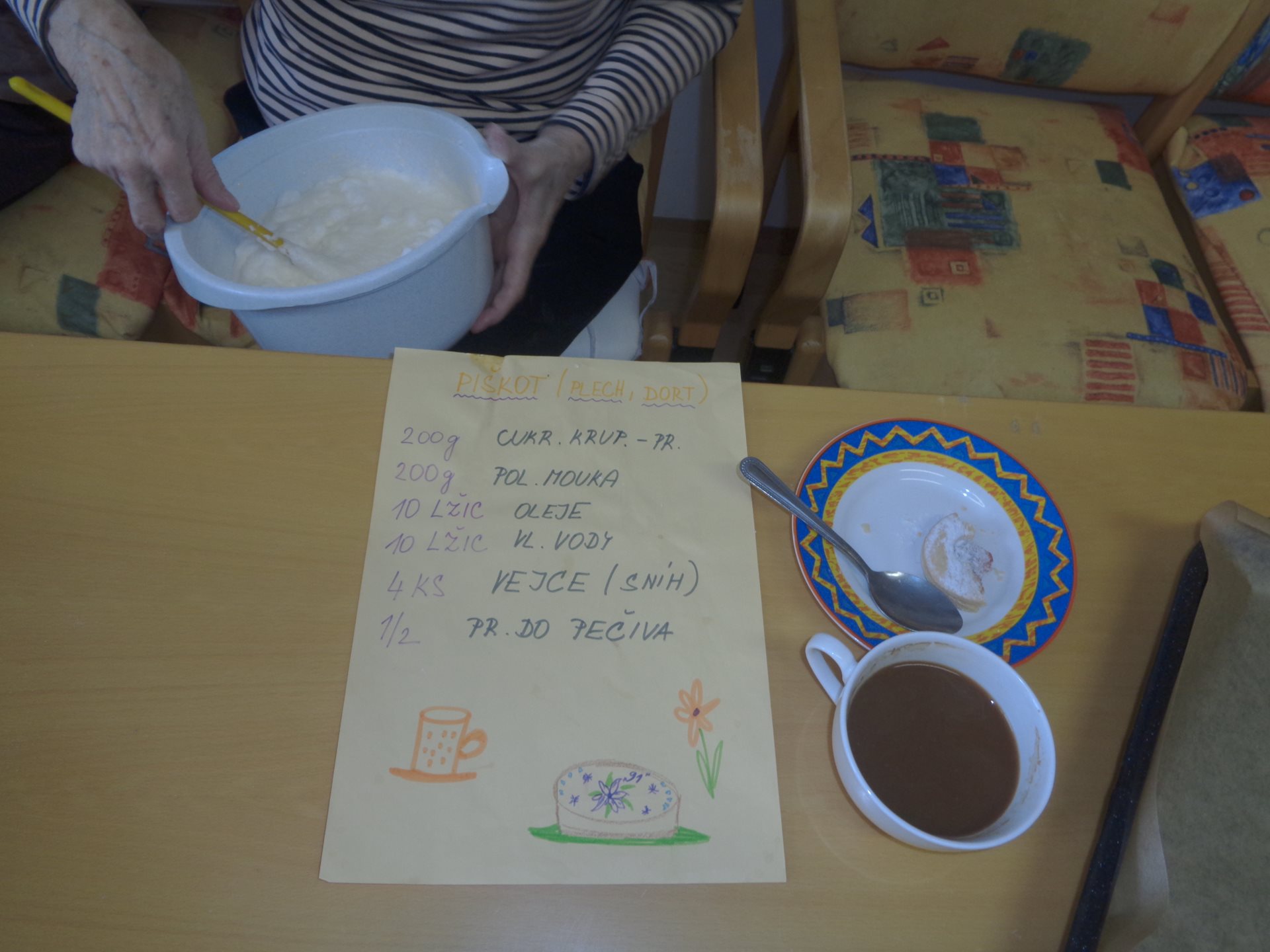 Příprava odpolední svačinky - pudink a pečení dortu na oslavu lednových jubilantů.