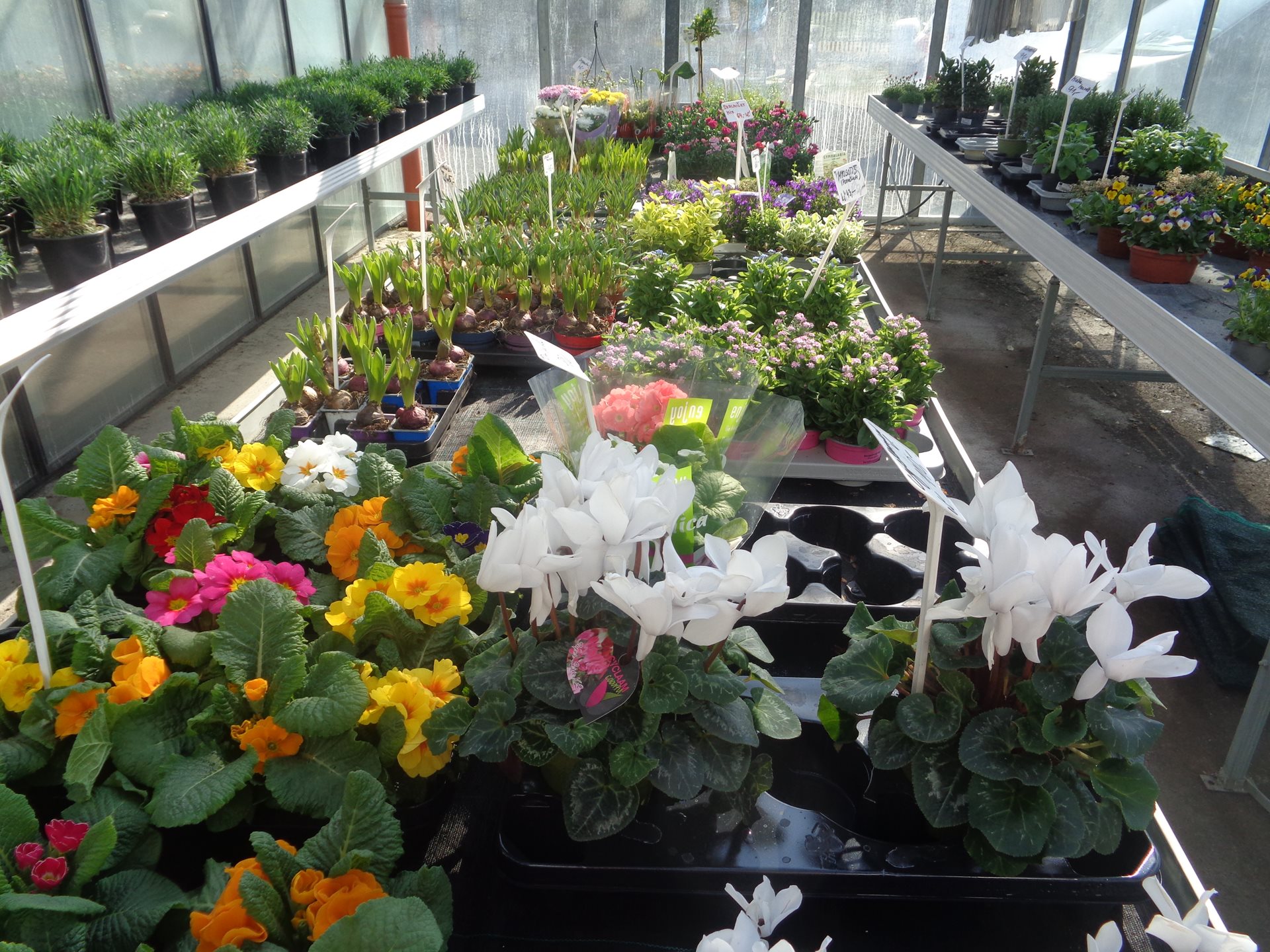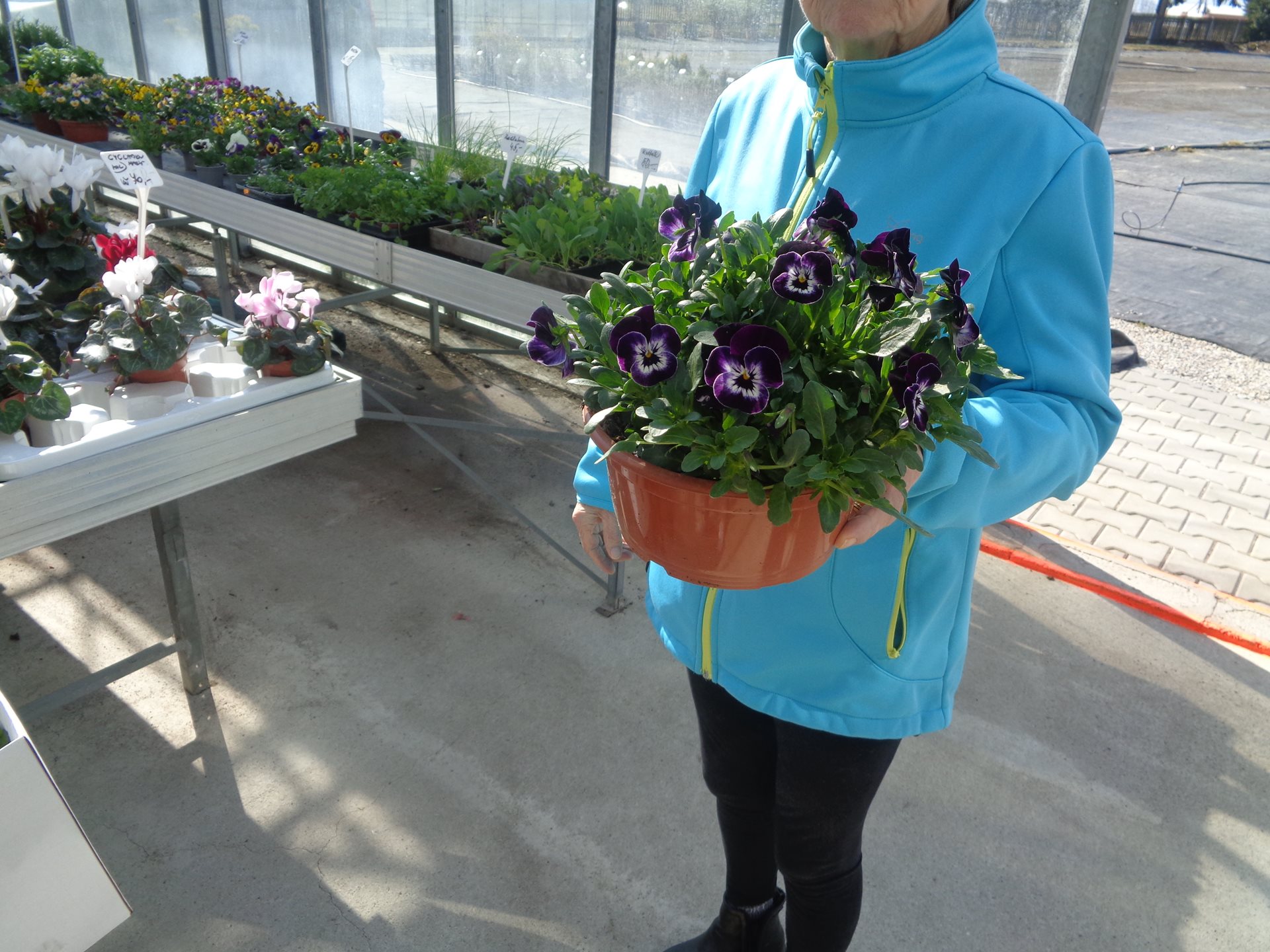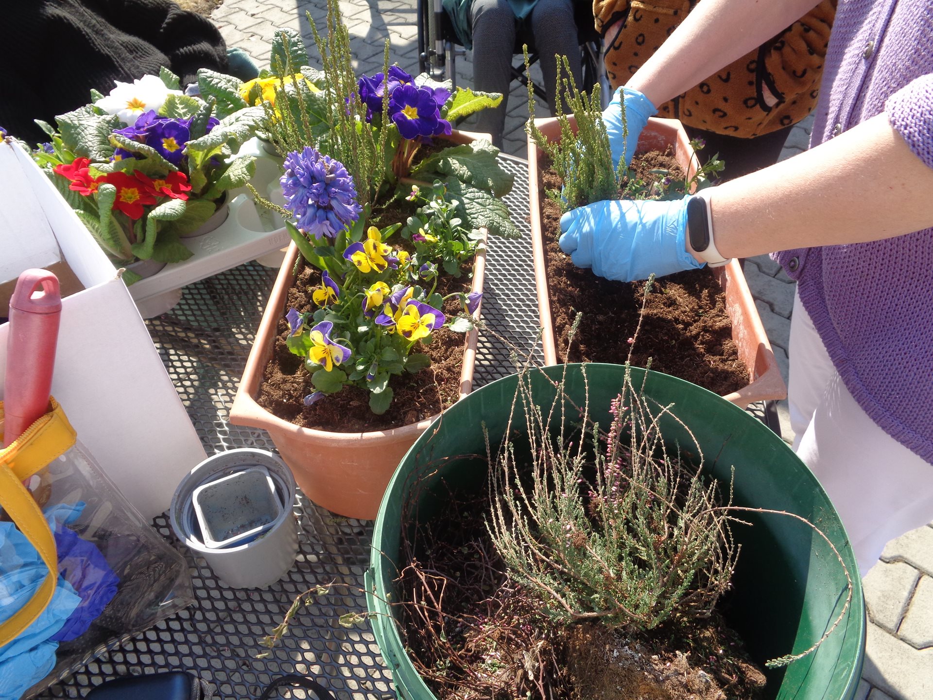 Nákup květin na jarní výzdobu Domova v zahradnictví a jejich sázení.