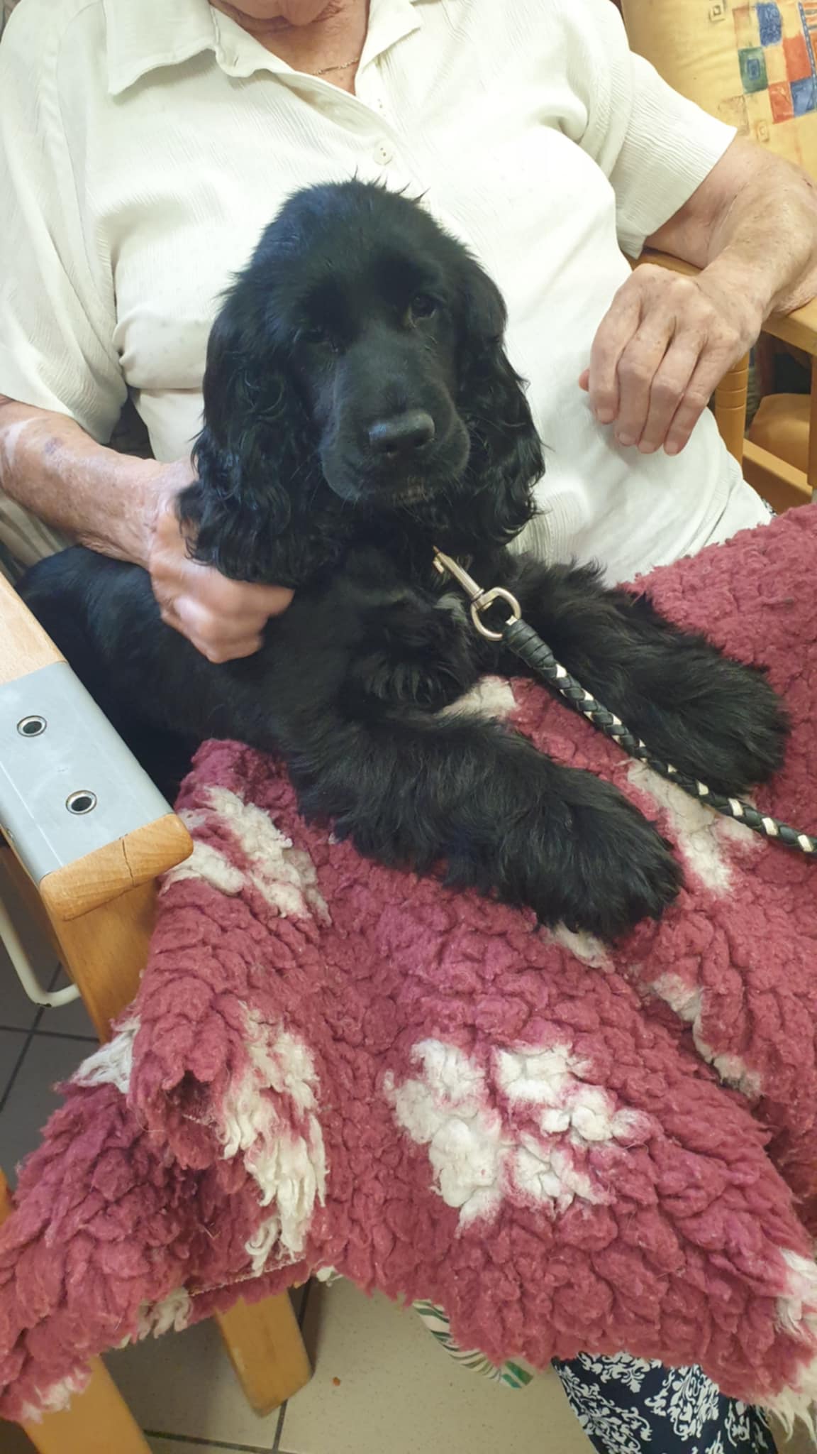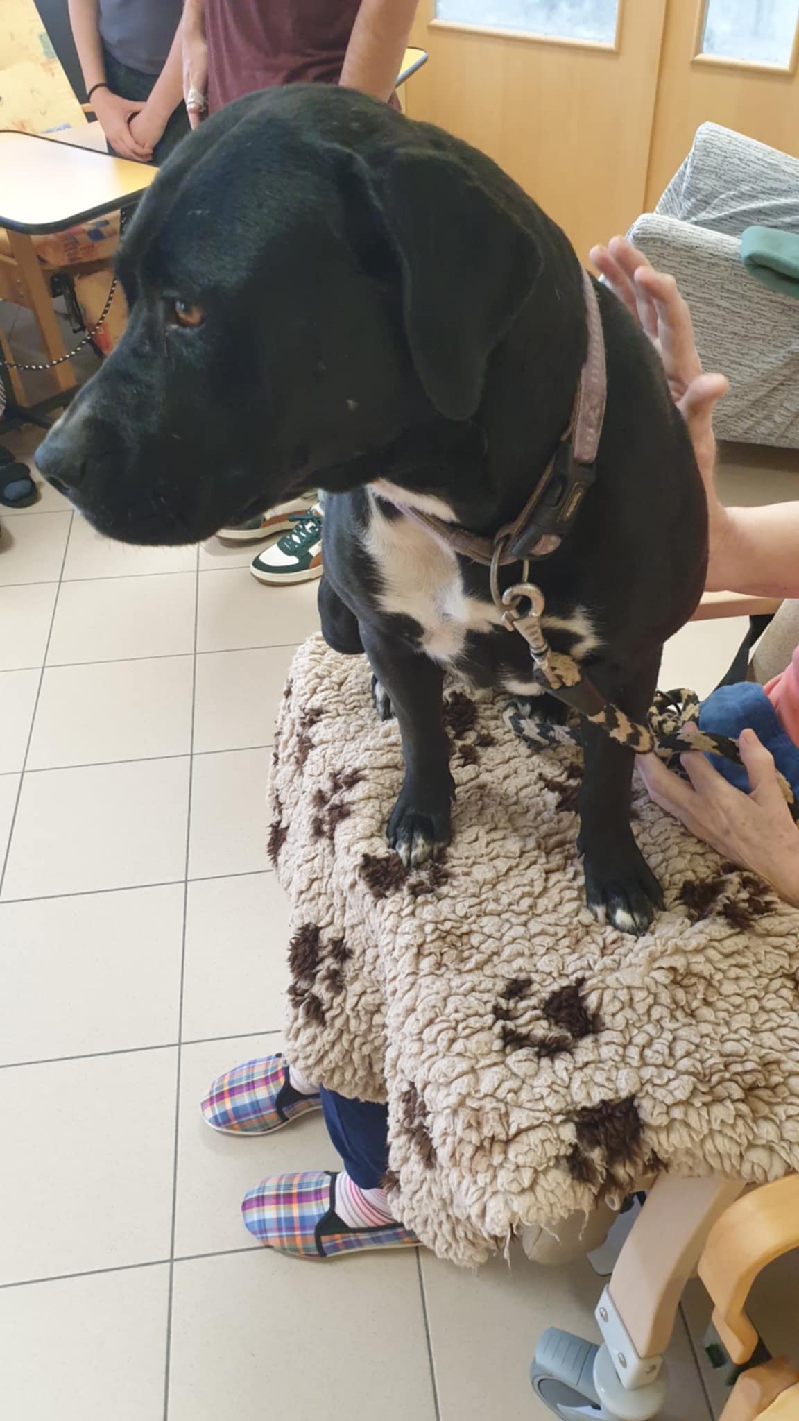 Tentokrát nás navštívila klidná a zkušená fenka Megy, která je vhodná i pro práci s imobilními uživateli /v lůžkách/. Společnost jí dělala také čtyřměsíční štěňátko Bejly, které si všechny získalo svou roztomilostí a veselou povahou.