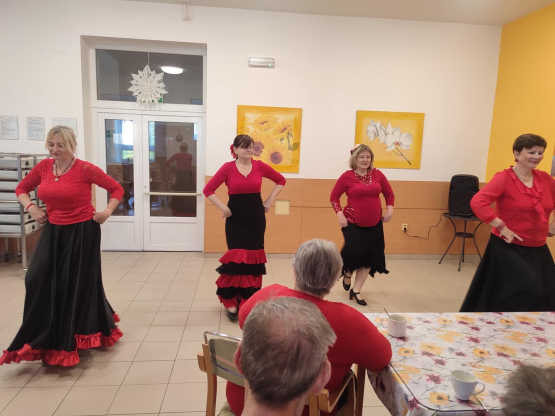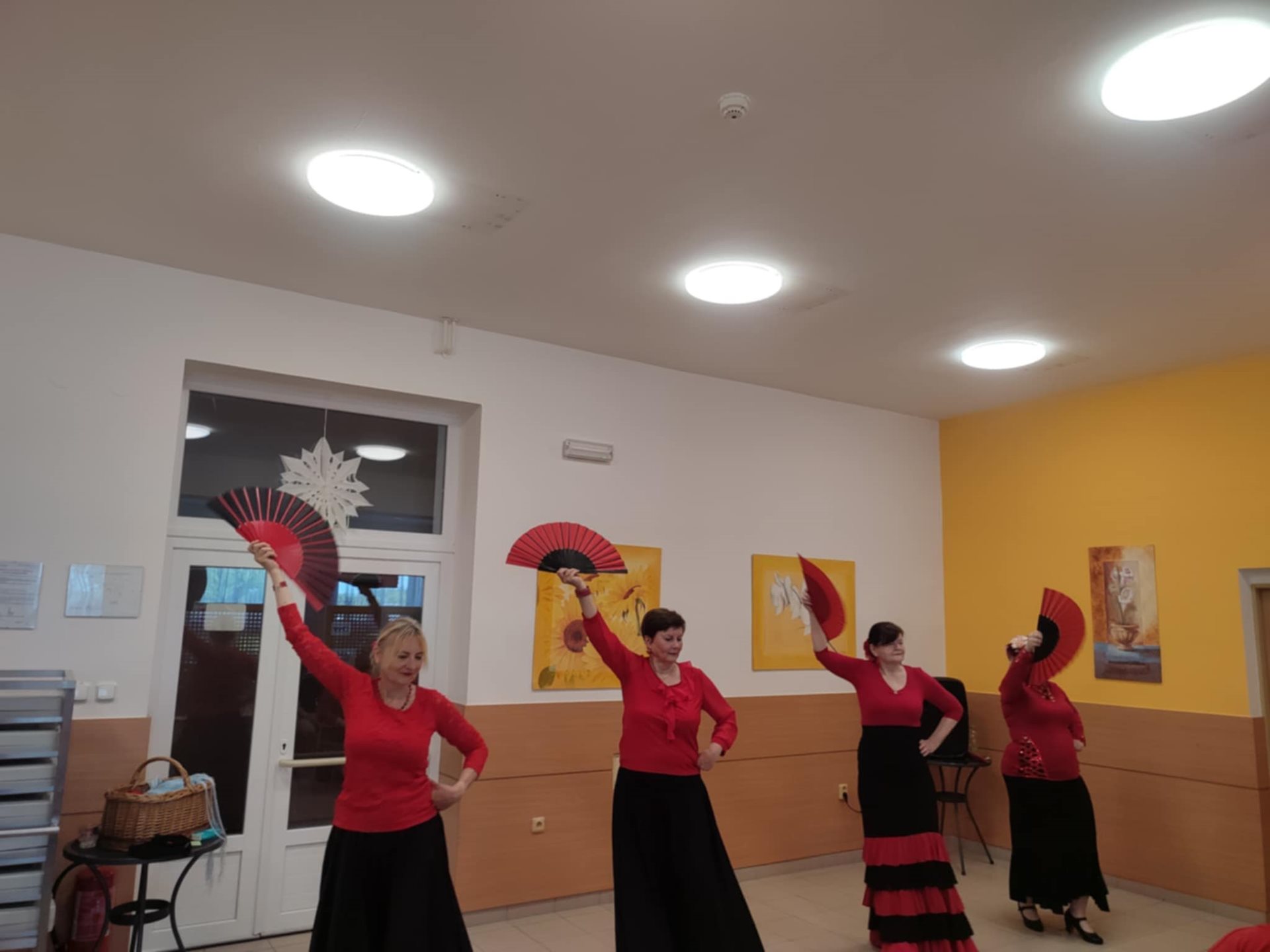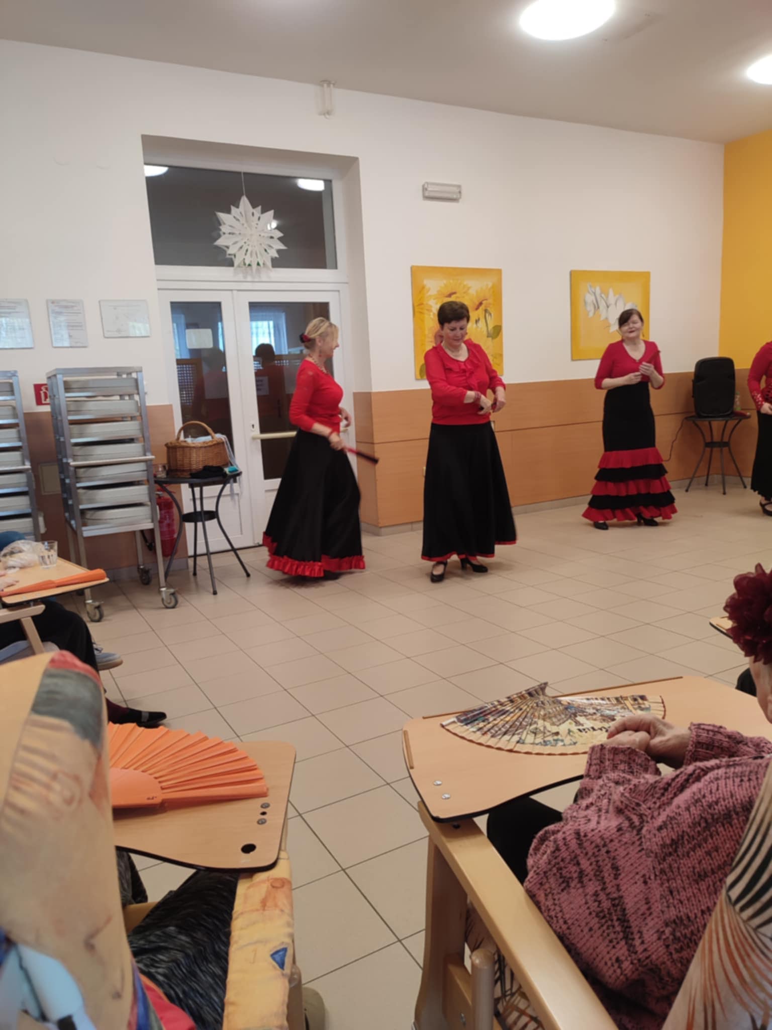 Tanečnice mají vždy bohaté sukně laděné do černo červena. Ve vystoupení u nás v Domově využily vějíře a šátky, které následně půjčily také našim uživatelům k prohlédnutí.