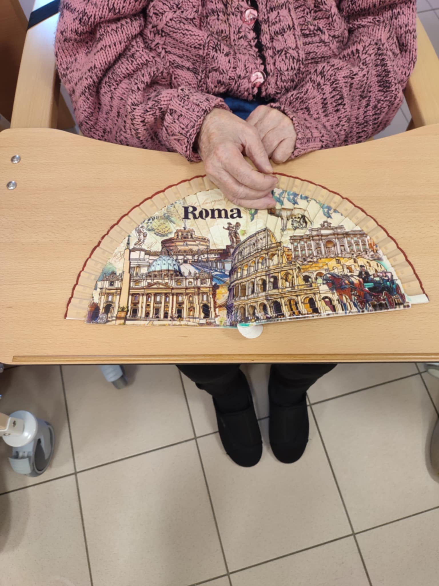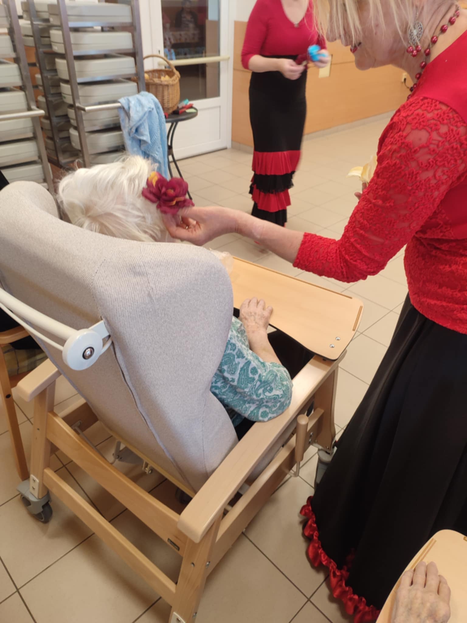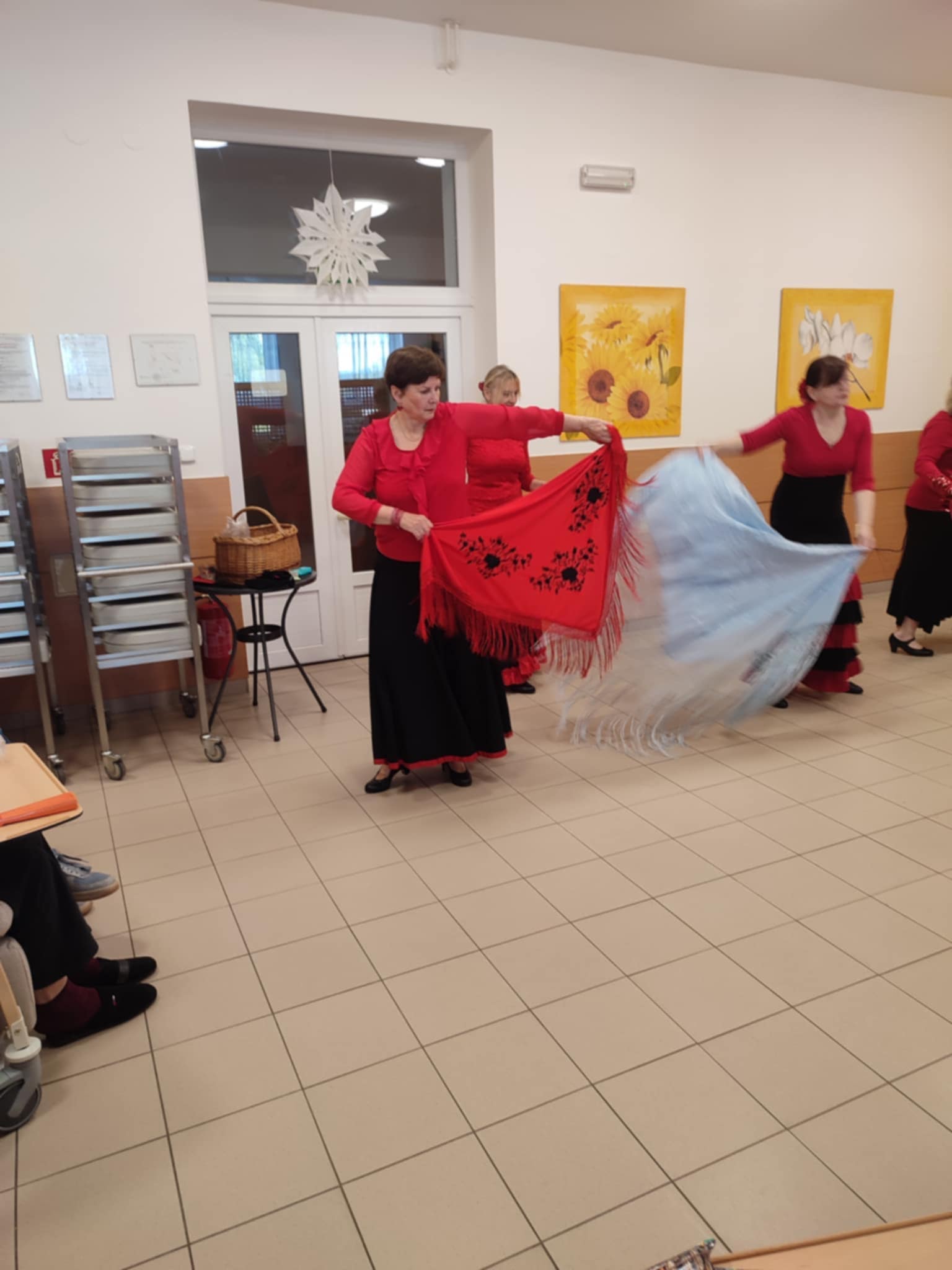 Tanečnice mají vždy bohaté sukně laděné do černo červena. Ve vystoupení u nás v Domově využily vějíře a šátky, které následně půjčily také našim uživatelům k prohlédnutí.
