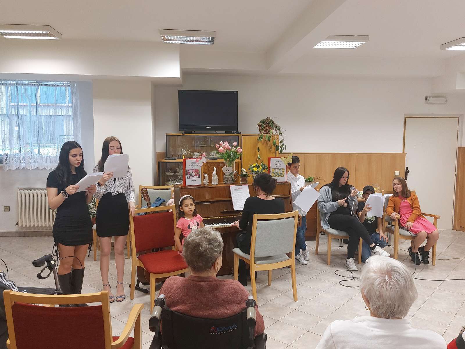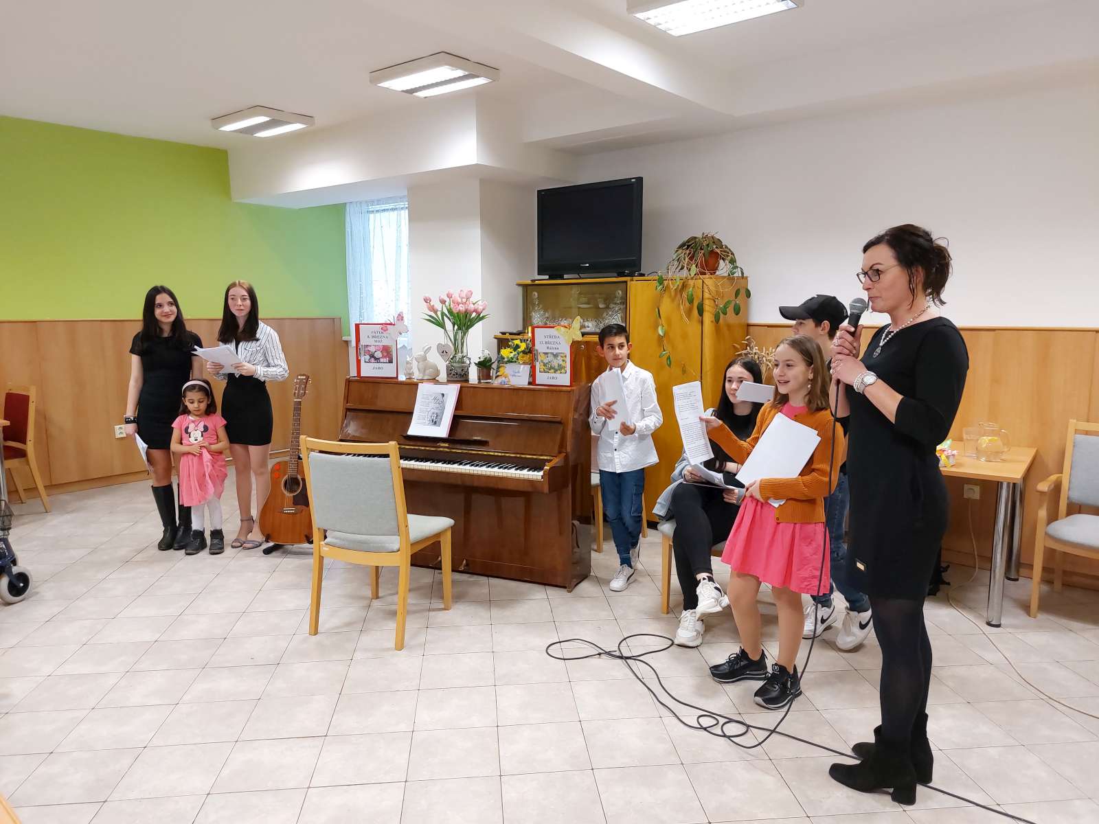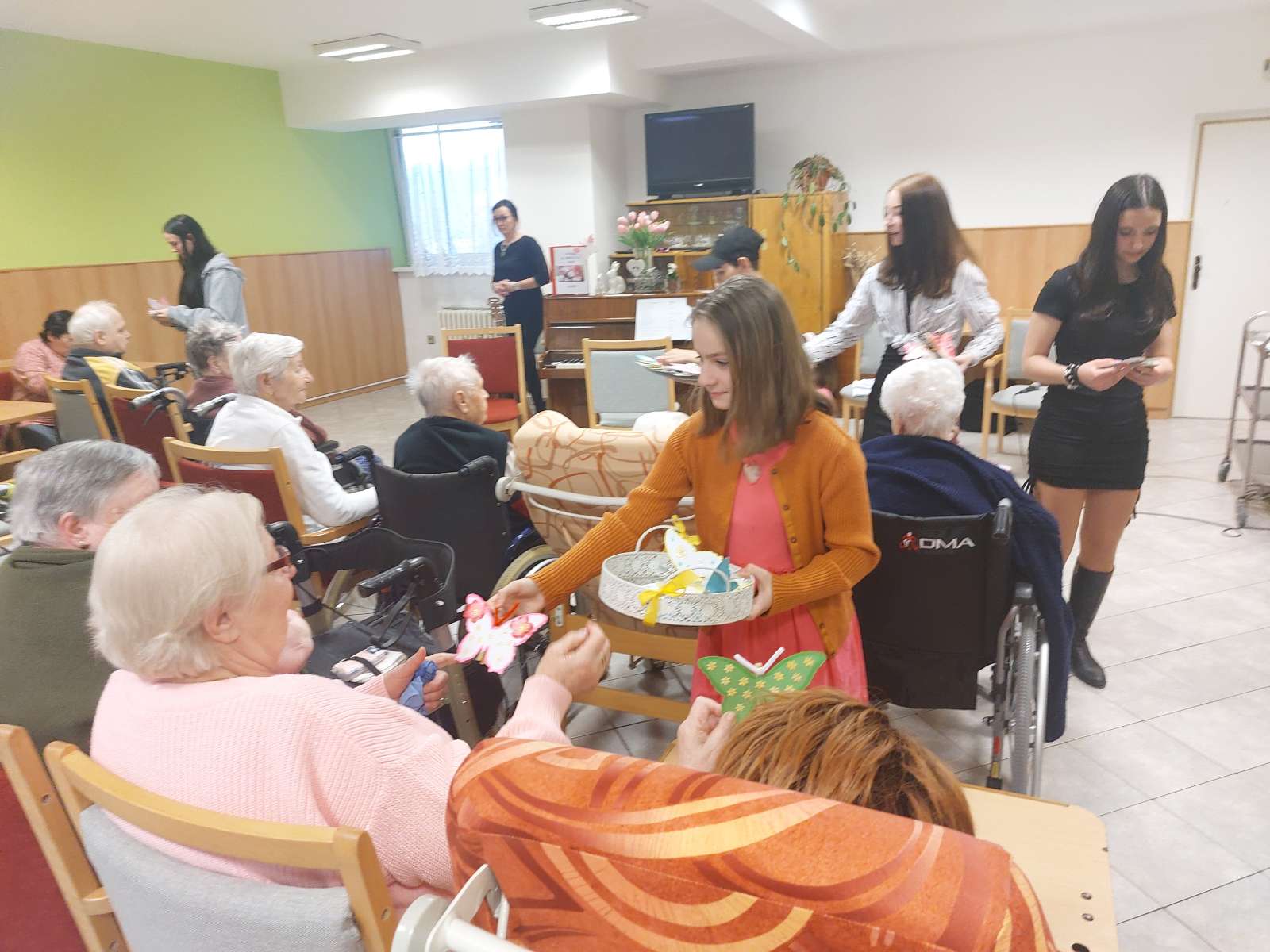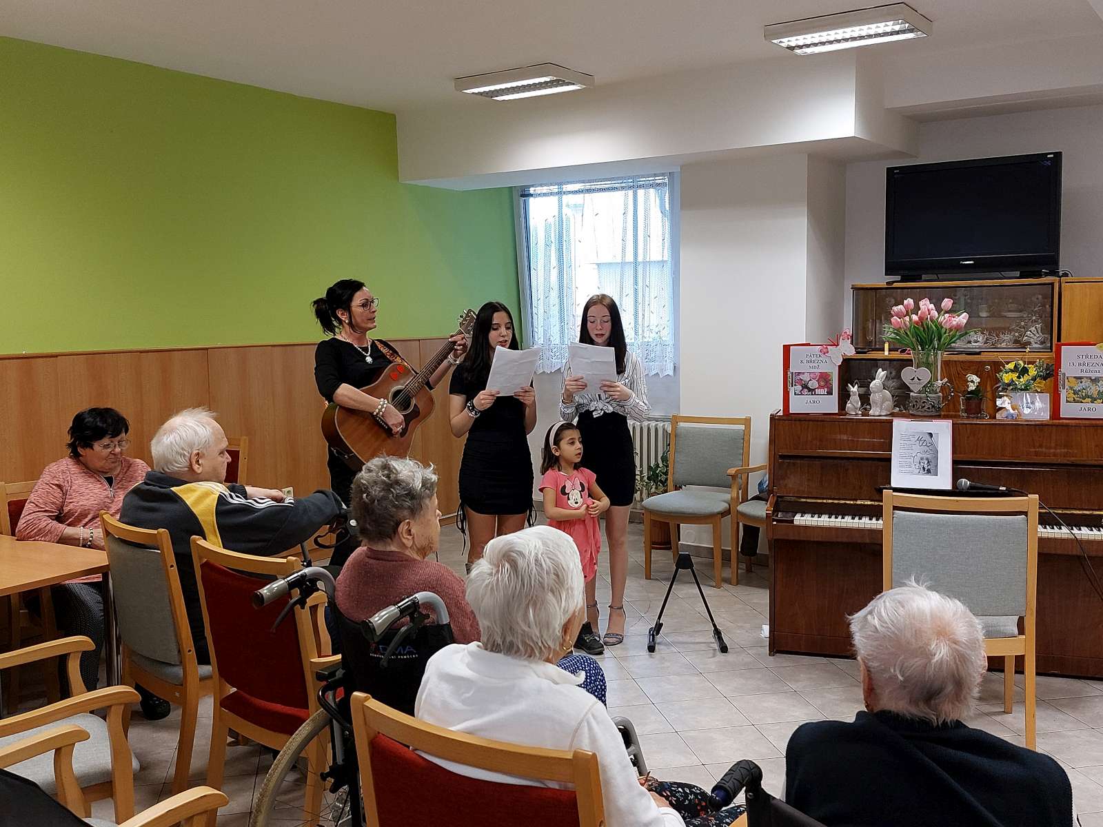 Ve středu 13.3.2024 k nám opět zavítaly děti z Dětského domova Štíty, aby naše klienty nejen potěšily svou návštěvou, ale hlavně aby jim zazpívaly a dodatečně popřály k MDŽ. Děti měly připravené pásmo písniček s hudebním doprovodem kytary a klavíru (pod vedením "tety" Lucky Kuběnkové), skladby prokládaly také básničkami a nakonec všem našim klientům předaly ručně vyrobené motýlky. Všechny to moc potěšilo a už se těšíme na jejich další návštěvu.